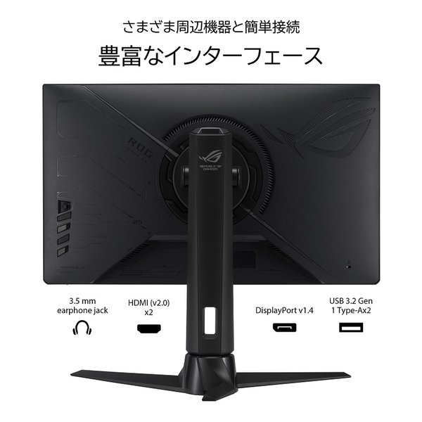 ■主な付属品:キャリブレーションレポート、DisplayPortケーブル、HDMIケーブル、電源アダブター、電源コード、クイックスタートガイド、クイックリリーススタンド、ROGステッカー、USBケーブル