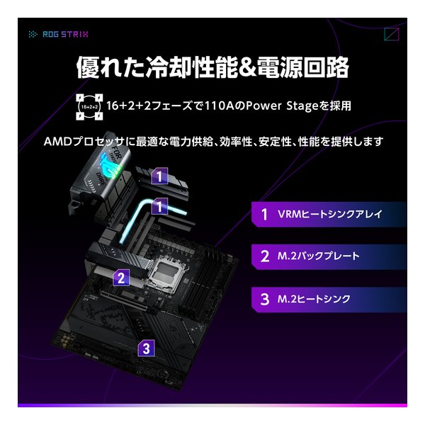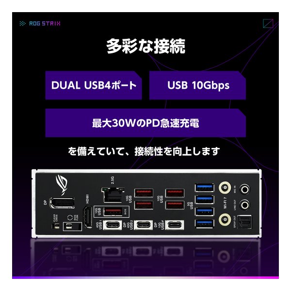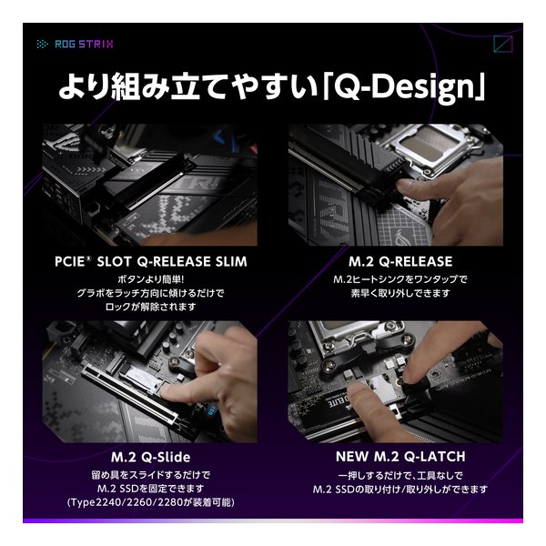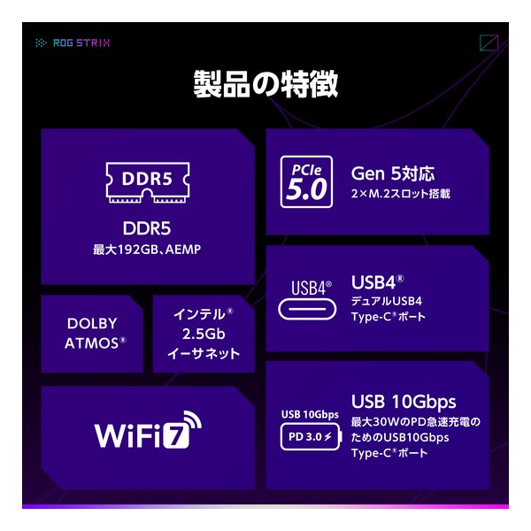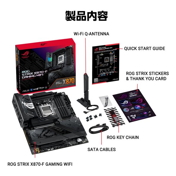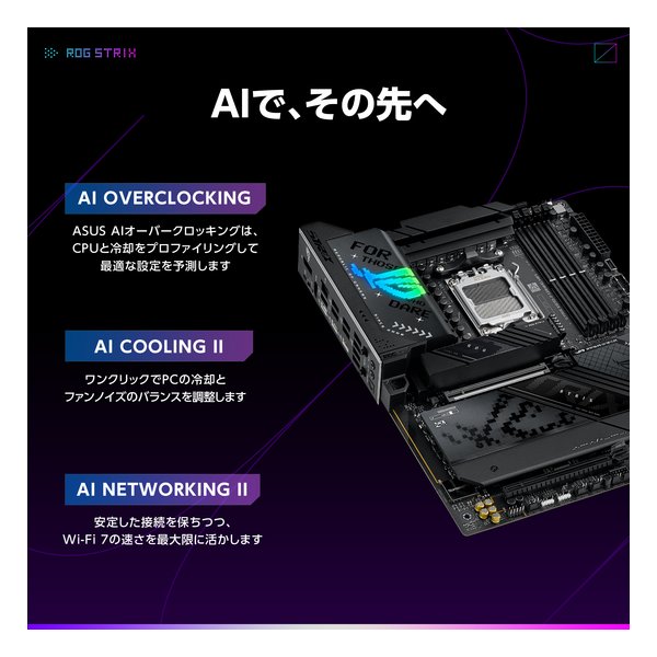 ●ROG Strix X870-F Gaming WiFi は、AMD Ryzen? 9000 シリーズ デスクトップ プロセッサーで優位に立つように構築されています。高度な電源設計と AI ソリューションが最高のパフォーマンスを保証し、デュアル USB4 Rポート、WiFi 7、高速 DDR5 スロットが最先端の接続性を提供します。このマザーボードは、エリート ゲーミングと高度な AI PC アプリケーションの要求に不可欠なパワーとスピードを提供します。