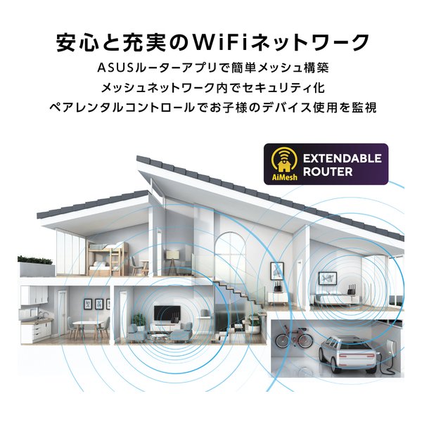 複数のWi-Fiルーターを繋ぎ合わせて、隅々まで広い通信範囲を提供するメッシュネットワークシステムAiMeshに対応。