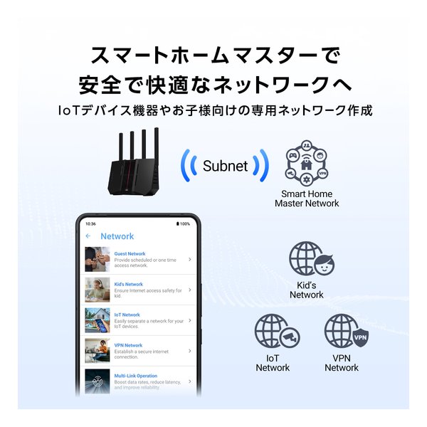 IoTスマートデバイス機器やレガシーデバイス専用のネットワークを作成し、WiFi7との接続を確保。お子様向けの専用キッズネットワークを作成し安全で便利なネットワーク管理体制を構築。