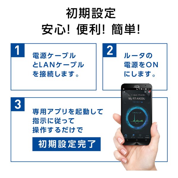ASUS専用アプリから手順にしたがって操作するだけで簡単に初期設定が完了します。