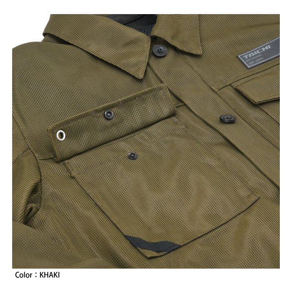 胸元・腹部にポケットを装備。胸部のポケットはボタンで留める仕様。