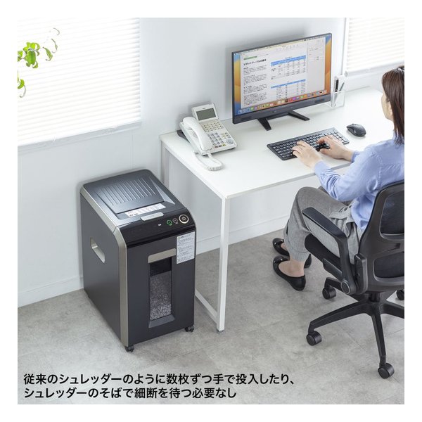 ●従来のシュレッダーのように数枚ずつ手で投入したり、シュレッダーのそばで細断を待つ必要がありません。