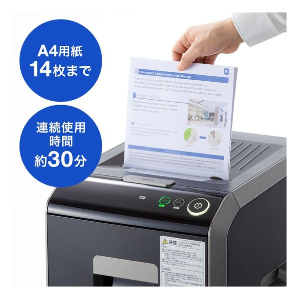 ●手差し細断も可能で、A4用紙最大14枚までの同時細断が可能です。