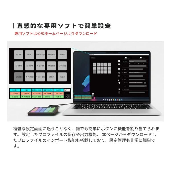 専用ソフトウェアで設定した機能をワンボタンで実行できるため、マウスやキーボード操作を減らし、