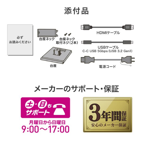 ■付属品:電源コード(PSE適合品)、HDMIケーブル、USBケーブル(C-C USB 5Gbps (USB 3.2 Gen1))、